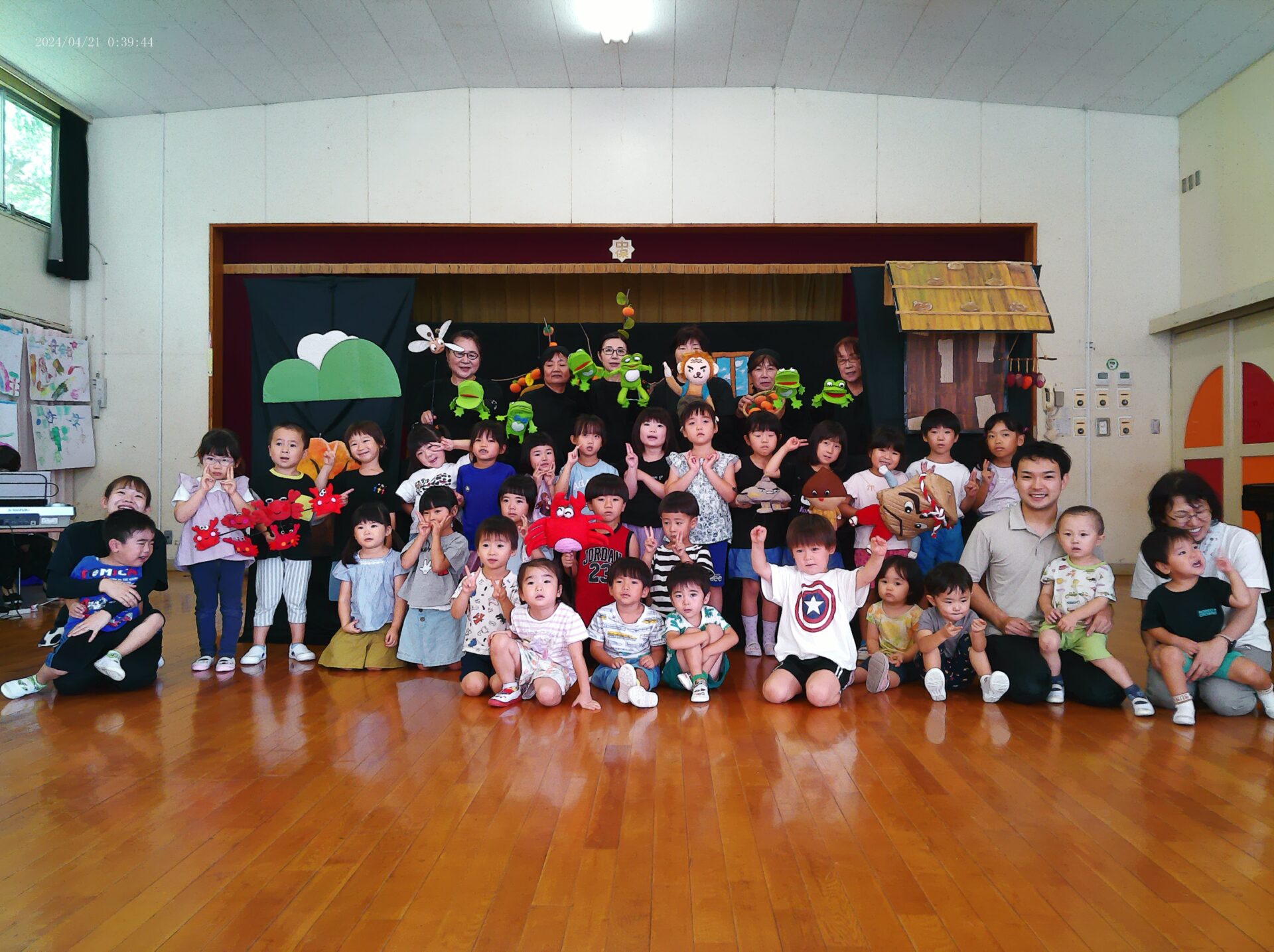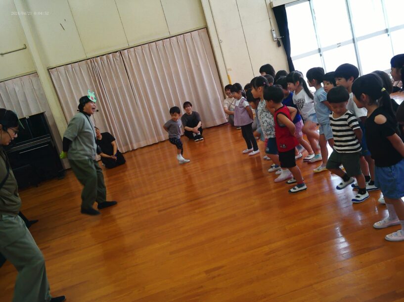 子どもたちも興味津々で、劇の最中はじっと見守り、みんなで歌って踊るところでは、人形劇サークルの人たちと一緒に楽しそうにしていました。